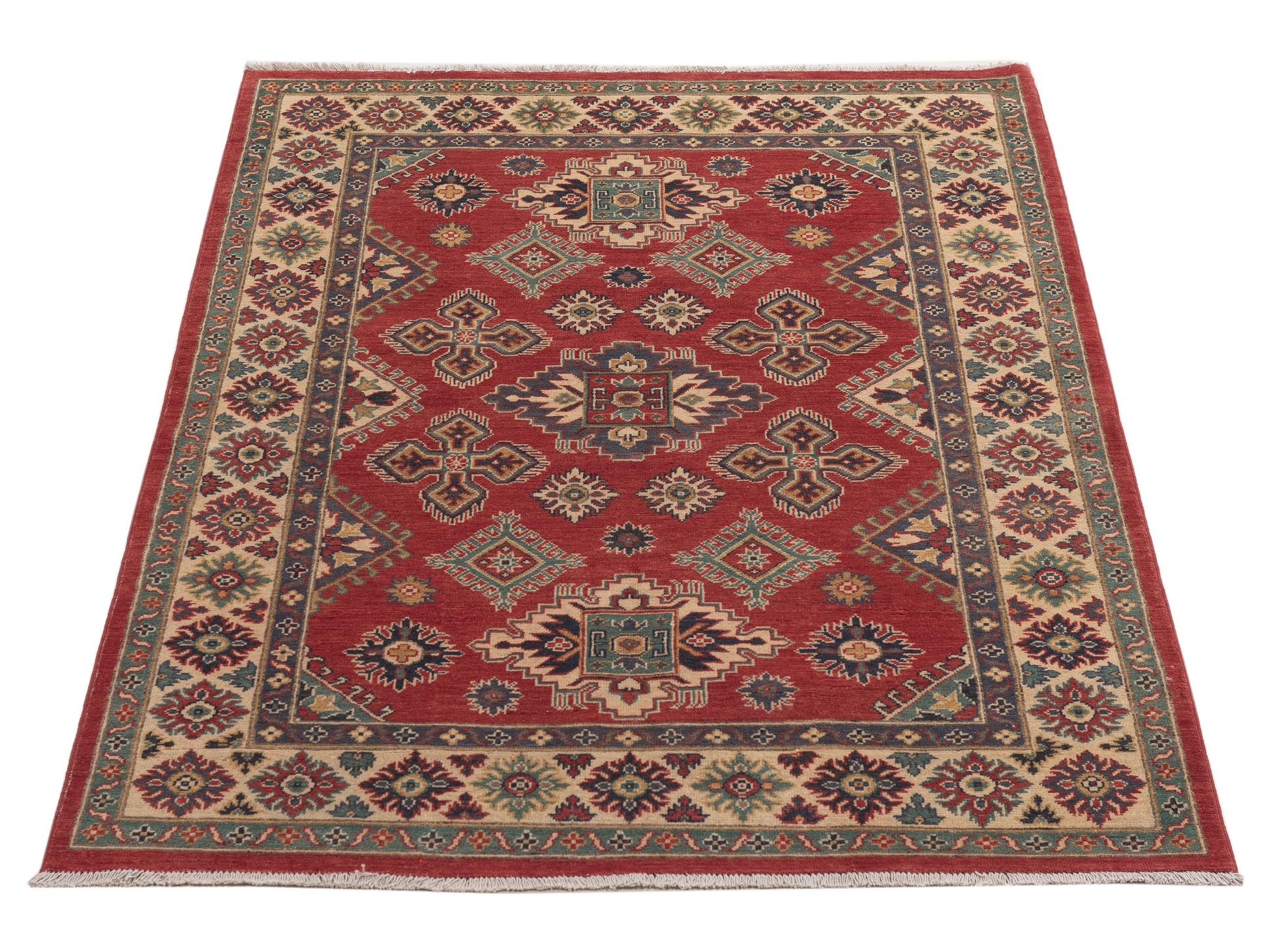 Elevate your space with our Red Kazura rug, made from Handspun Wool Sized at 5x7, it's a timeless piece that blends beautifully with any decor.